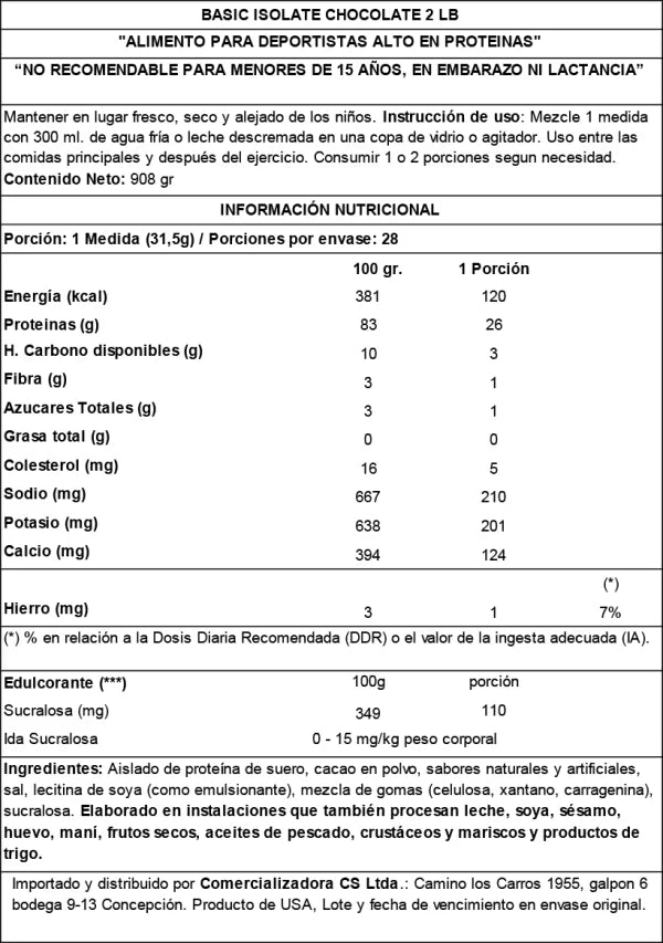 Aislado de proteína de suero, cacao en polvo, sabores naturales y artificiales, sal, lecitina de soja (como emulsionante), mezcla de gomas (celulosa, xantano, carragenina), sucralosa.