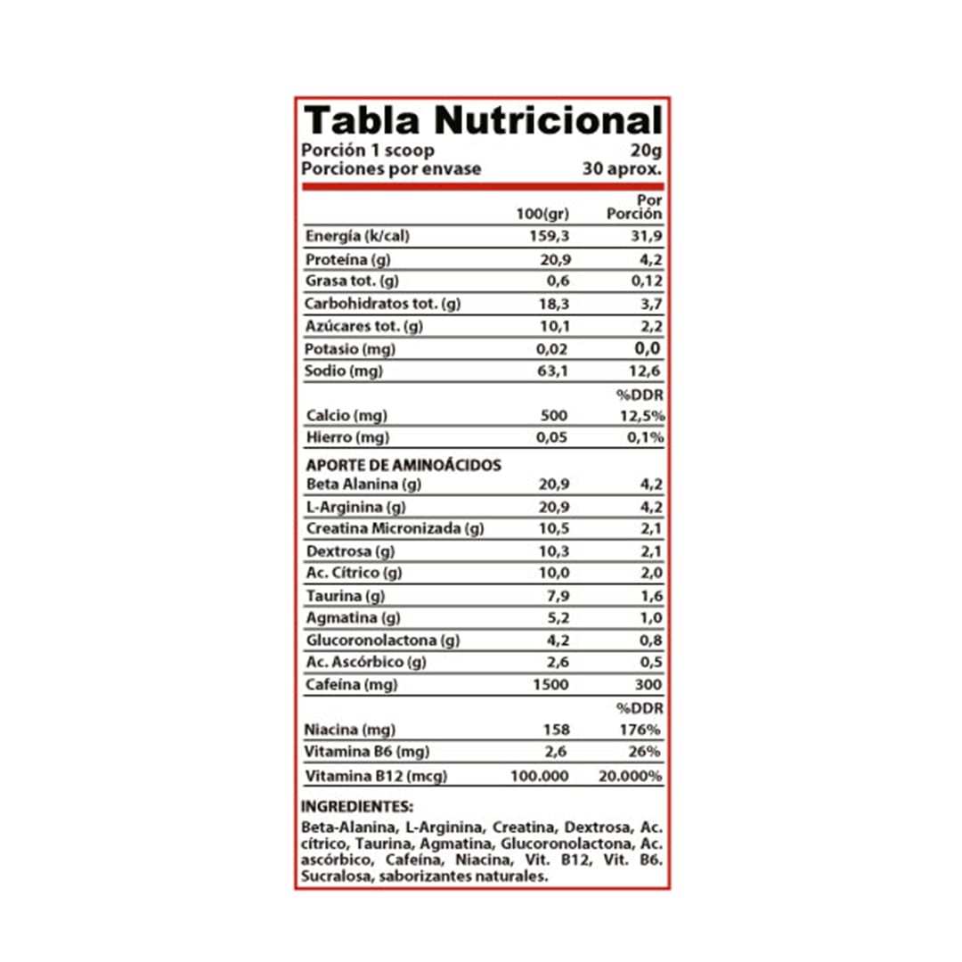 - Con adición de aminoácidos, cafeína, creatina y beta alanina.