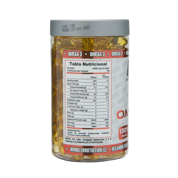 El Omega 3 de Winkler Nutrition es un complemento ideal para aquellos que desean aumentar la ingesta de este acido graso esencial. El Omega 3 no puede ser producido por nuestro cuerpo, por lo que es necesario sumarlo a nuestra dieta ya sea en las comidas o como suplemento.